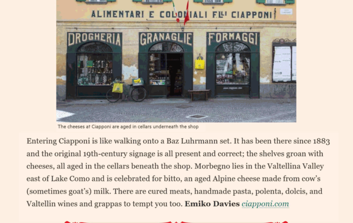 La Bottega dell’orologio dei Fratelli Ciapponi, situata nel centro storico di Morbegno, con l’antica insegna tuttora conservata di “Drogheria – Granaglie – Formaggi – Cordami” , nasconde nel retrobottega un sorprendente susseguirsi di volte, colonne e celle ad alveare che si snodano nella cantine con altrettanti spazi in penombra, dove giacciono ben allineate le tonde forme di Bitto d’annata e quelle invecchiate fino a dieci anni, i gustosi Salumi Valtellinesi, i Pregiati Vini e le Profumate Grappe.